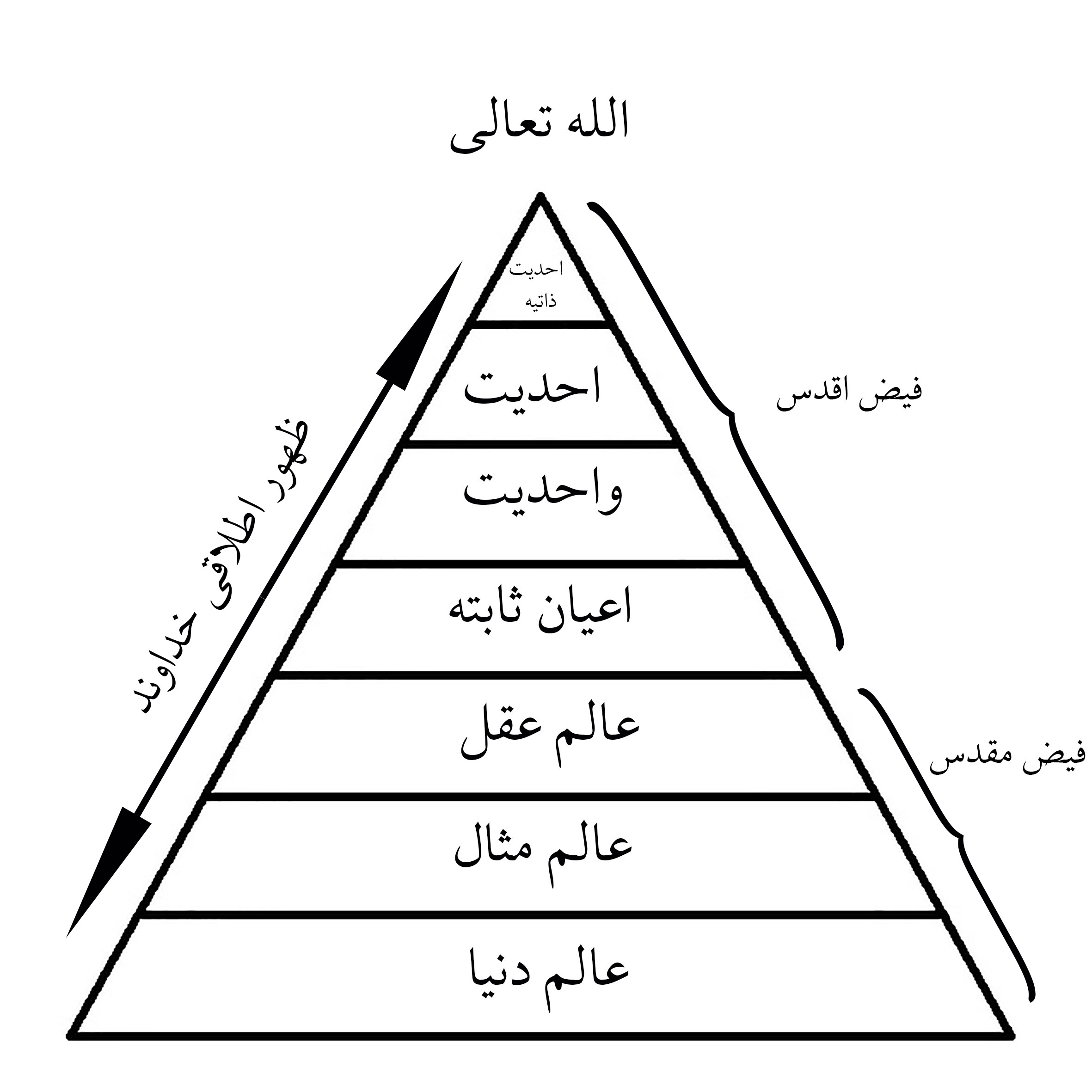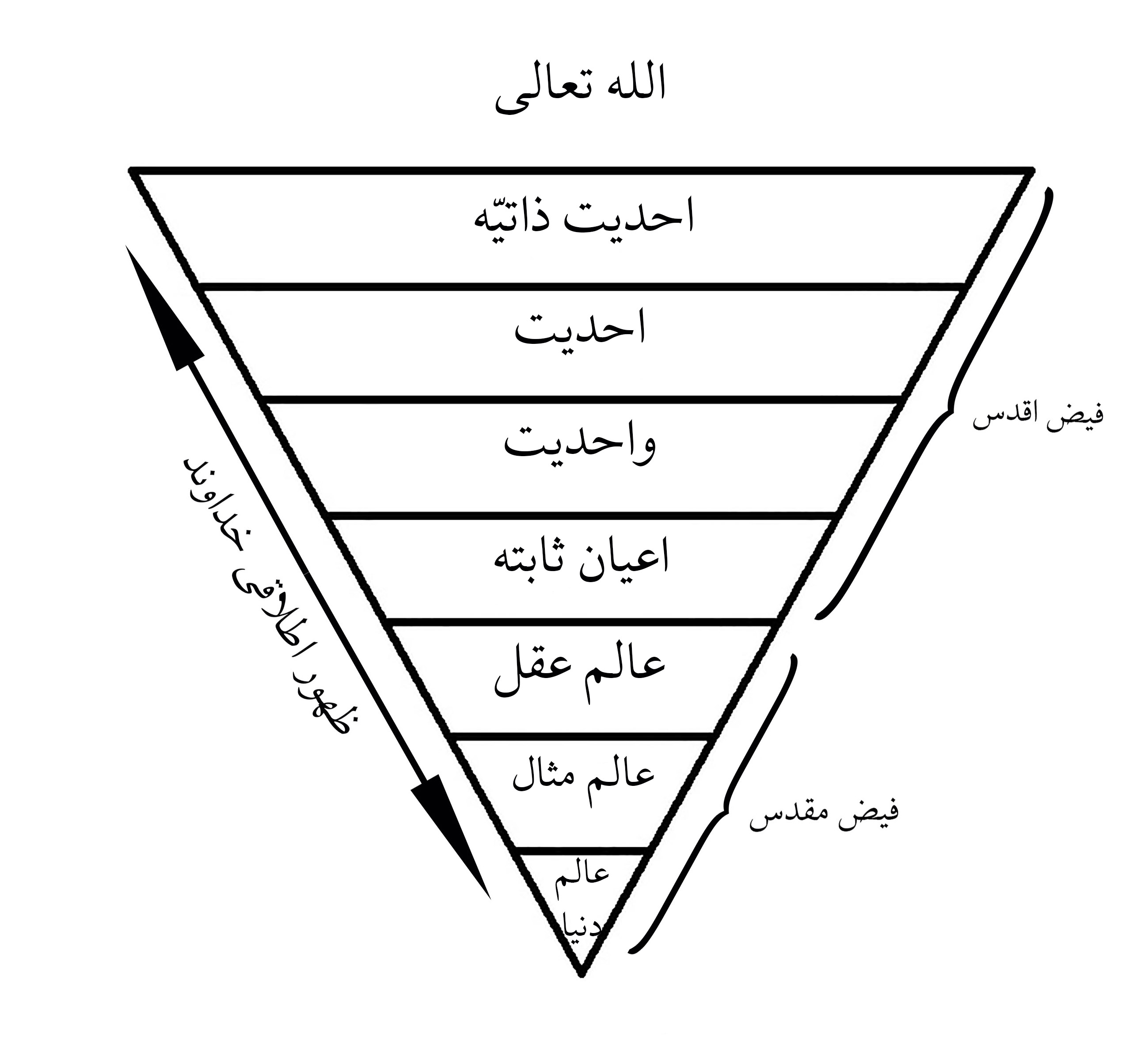 عارف جهانشناسی خاص خود را دارد. او در این جهانشناسی، ماسوی الله را که همان فیض اطلاقی خداوند است، به صورت هرمی تصویر میکند. این هرم فیض دارای درجاتی است، زیرا مشکک است. سلوک سالک در متن این درجات فرض میشود. درجات اصلی و کلّی این فیض زیاد نیست، اگرچه هر درجه خود دارای درجات فراوانی است. آنچه در اینجا مورد نظر ماست، همان درجات اصلی و کلّی است. نمودار هرم فیض اطلاقی خداوند چنین است: